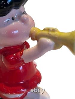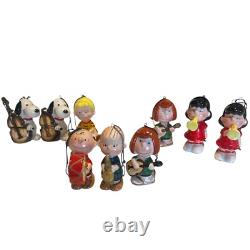 Complete set of ornaments with a few extras to boot! Please read carefully to understand condition of ornaments. Charlie Brown with drum - no chips or cracks but some paint loss on drum. Linus with saxophone: some minor paint loss, no chips or cracks. Schroeder with piano - flea bite chips on edge of piano and one on shoe. Very minor paint loss, marked 1951. Snoopy with stand up bass #1 marked 1966, some crazing to glaze. Snoopy #2 - neck of bass broken off. Peppermint Patty with guitar #1 - has a chip that could be glued back on. Paint loss to hair marked 1966. Peppermint Patty #2 - head was broken clean off. I glued it back on. It is a pretty clean repair (in my opinion) - hard to spot the repair! Paint is in pretty nice condition on this one. Both Lucys have been repaired by me- both arms/trumpets were broken off. Repairs are visible but in my opinion they are still displayable.